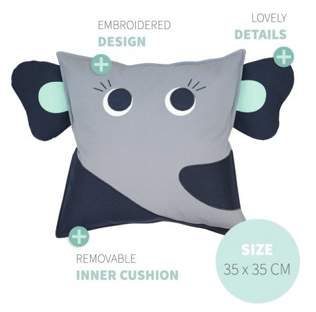 Puten elefanten Moa er utformet som et dyreansikt med storer ører, som kan dras i. Ørene kan selvfølgelig også brukes til å legge seg inntil, hvis man har bruk for å litte og slappe litt av på sofaen eller i sengen.